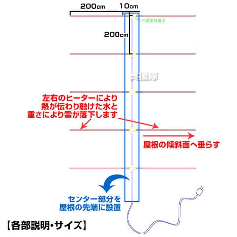 センター部分を屋根の先端に設置し、ヒーター部分を屋根の傾斜部分に垂らします。