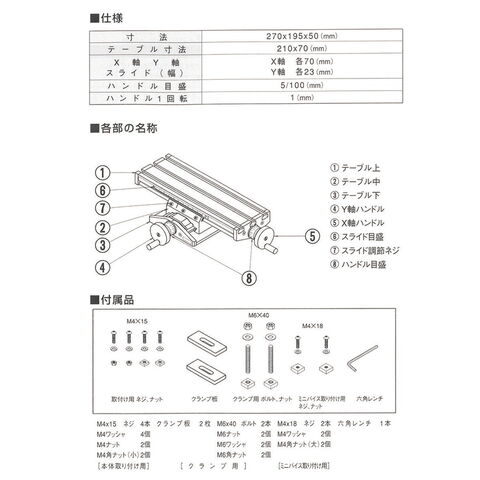 ハンドル目盛 0.05mm/1目盛(1mm/1回転)。