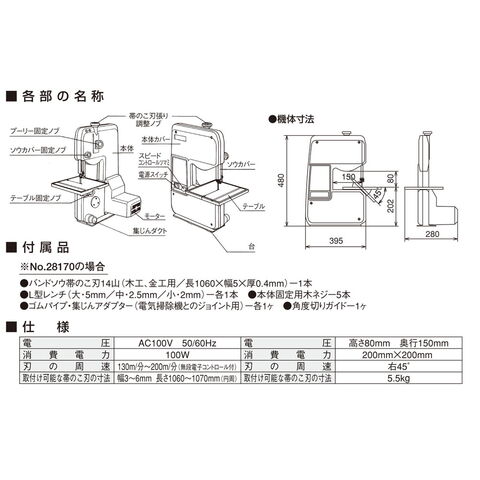 セット内容:ハンドソウ鋸刃(14山・幅5mm周長1060mm・No.28176)・L型レンチ(大・中・小)・角度切りガイド・本体取付ネジ×5・集塵用ゴムパイプ・集塵アダプター(掃除機用)。