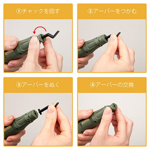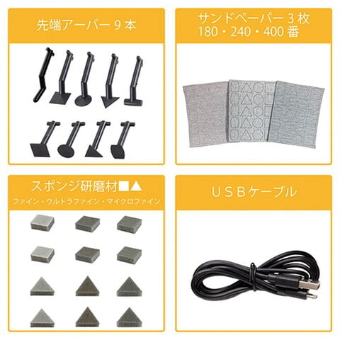 付属品 アーバー9種・ペーパー3種各1枚・研磨スポンジ2形状3種各2個。