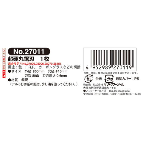 品名 プロクソン 超硬丸鋸刃 50mm No.27011