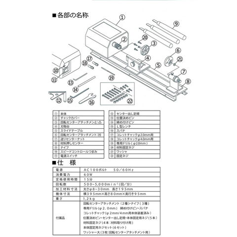 セット内容:回転センターアタッチメント2種・専用ナイフ3種・ドリル(径2mm)・コレットチャック(径2.0・4.0mm用)・L型レンチ・スパナ・位置決めピン・センター出し定規・本体固定木ネジ×5・本体固定ビス×6・本体固定ナット×6・本体固定ワッシャ×6・材料固定ビス×4ワッシャ大×3。