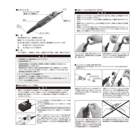 ドリルチャック  径0.5~3.2mmまでのシャフト軸の先端工具が取付可能。
