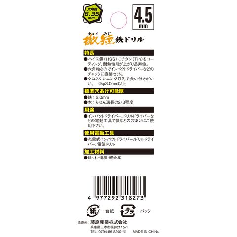 品名 SK11 六角軸Tin鉄ドリル 微短 4.5mm 5pcs