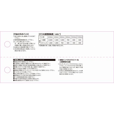 ●用途以外のご使用はしないで下さい。ご使用前に本製品に亀裂や欠け、軸のゆるみがないかご確認下さい。使用する電動工具本体の取扱説明書をよく読み正しくご使用下さい。●保護メガネやマスク等の作業に適した服装でご使用下さい。まわりの安全をご確認いただきご使用下さい。揮発性可燃物(ガソリンやシンナーなど)の近くではご使用にならないで下さい。●ドリル刃には十分注意して下さい。加工材料は動かないようにしっかり固定して下さい。使用後のドリル刃及び加工材料は高温になります。ドリル推奨回転数を目安に使用下さい。市販の水溶性切削油のご使用をお勧めします。無理な負荷をかけてご使用にならないで下さい。