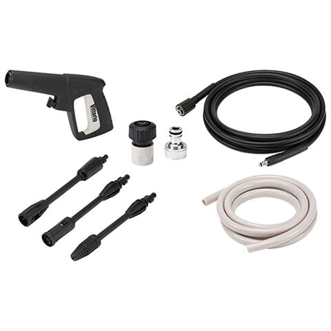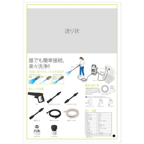 標準付属品:ガン・バリオジェットノズル・サイクロンノズル・接続ランス・高圧ホース5m・給水ホース3m・オスカプラ・メスカプラ。