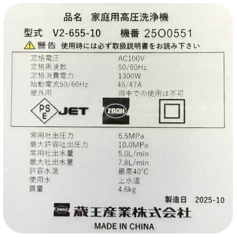 品名 蔵王産業 ZAOH 高圧洗浄機 Vittorio V2-655-10