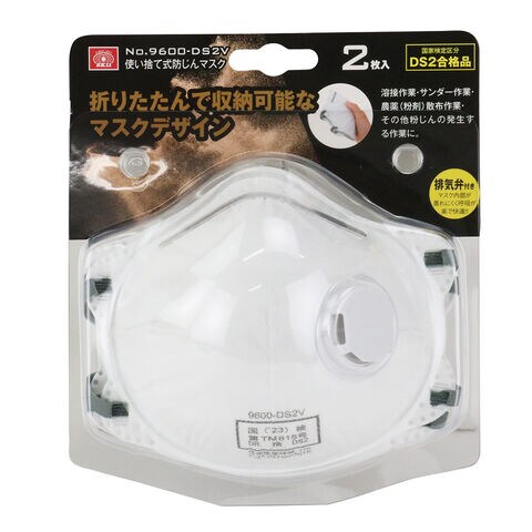 ●警告:この防じんマスクで誤った使用をされますと健康に障害を及ぼしたり声明を脅かすことがありますので、付属の説明書をよくお読みの上、ご使用ください。(使用の範囲)。このマスクは粉じんなどの粒子状の物質の発生する場所で使用する防じんマスクです。有毒ガス・蒸気や液体粒子の発生している場所及び酸素濃度18%未満の場所では使用できません。●使用上の注意:酸素濃度18%未満の場所及び有毒なガス・蒸気の発生している場所では使用できません。人によってはマスクの接触部分にアレルギー反応やかぶれを起こす事があります。その場合は使用を中止してください。使い捨てマスクの使用限度時間を把握してください。使用限度時間を超過した使い捨てマスクは廃棄してください。使い捨てマスクの汚れ・破損またはしめひもの破損が生じた場合は、使用限度時間以内であっても、新品とお取替えください。保管は清潔な乾燥した場所を選んで異物が付着しないようにしてください。マスクを洗って再使用しないでください。幼児の手の届く所、直射日光の当たる所、高温になる所には置かないでください。使用済マスクは有害物質を含んでいる可能性があります。廃棄の際は取扱いに注意してください。髪などが使い捨てマスクの性能や顔への密着性に影響を与えることがあります。●9600-DS2Vは、排気弁に穴、亀裂がないか、また、排気弁に異物が付着していないか、目視で点検してからご使用ください。●点検項目:マスクに破損または収縮や変形がないこと。マスクにはスポンジ・鼻あて。しめひも2本がついていること。9600-DS2Vは排気弁に穴・亀裂がないこと。しめひもに異常がないこと。使用限度時間に達しないこと。●廃棄:マスクが使用限度時間以内であっても型崩れ・損傷・収縮が生じた場合や目詰まりなどによって異常を感じたり息苦しくなったとき。使用限度時間に達したとき。使い捨てマスクを捨てる際はマスクの外側に直接手を触れないようしめひも部分を持ってマスクを外し、ビニール袋等に入れて口を縛ってからゴミ袋にすてるようにお願いします。また、マスクを捨てた後は石鹸を使って、流水で手をよく洗いましょう。