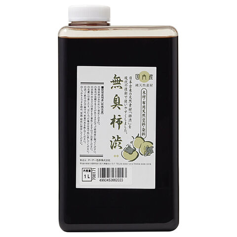 ●柿渋は塗って2~3日後に色が濃くなります。材の種類によっても色の出方が違うのであらかじめ端材などでテストしてください。日光の当たった場所が濃く染まり、当たらない場所はあたった場所より薄くなります。光の当たり具合でムラになることがありますので、乾燥には注意してください。日光に当てた時間が同じ場合、冬は夏よりも色が薄くなります。●使った刷毛はよく水洗いしてください。鉄分が塗装面にあると、柿渋と反応して黒~紫に変色します。施工等で鉄粉が飛んでいたり、鉄釘の頭があったりすると、変色しますので注意してください。●開封後はお早めにご使用ください。果肉が沈殿することがありますので、ご使用前に振って下さい。衣服や床などに付着すると着色しますのでご注意ください。●皮膚に付着したり、目に入った場合は水で洗い流してください。誤って飲み込んだ場合は、多量の水を飲んでください。しっかりとフタを閉め、室温、暗所に保存して下さい。●(木への塗装方法1サンドペーパーをかける)塗る前に必ずサンドペーパーをしっかりかけて素地の調整をして下さい。ペーパーは180番くらいの粗いものを使用するとよいです。木に汚れがついている場合、ペーパーでよく落としておかないと、柿渋を塗った後にはっきり目立ってしまいます。(木への塗装方法2木目にそって塗る)木目にそって、一定方向に刷毛を動かして塗っていきます。柿渋は、水のようにさらりとしているので塗りやすいです。刷毛は、普通のペンキ用のものでよい。使った刷毛は、よく水洗いしてください。濃くなりすぎると薄くすることができないので最初は2倍ぐらいに水で希釈して使用するとよい。(木への塗装方法3ウエスで拭き取る)塗り終わると表面に細かい気泡や、ムラがあったりするのでウェス(布)で均一になるようにふき取ってください。その後は自然乾燥してください(約24時間)。●(布を染める場合1)布を中性洗剤などでよく洗ってください。(布を染める場合2)ボールなどに柿渋を入れて、布をゆっくりと浸して、軽くしぼります。水で薄めた柿渋(倍程度)で数回に分けて染めるとムラなく染まります。鉄の容器は柿渋と反応するので、使わないでください。(布を染める場合3)日光の当たる風通しのよい場所で全体をきれいに伸ばして干します。
