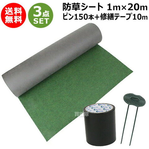 ★お得な3点セット★ 防草シート 1m×20m 無草 コの字ピン150本 修繕テープ10m セット【セフティー3 耐候性 約10年 強雑草対応 除草シート 雑草シート 雑草対策 雑草防止 草よけ 雑草よけ 緑 グリーン 通路マット 花壇 庭木 ガーデニング 園芸用 園芸 農業資材】