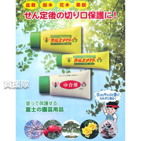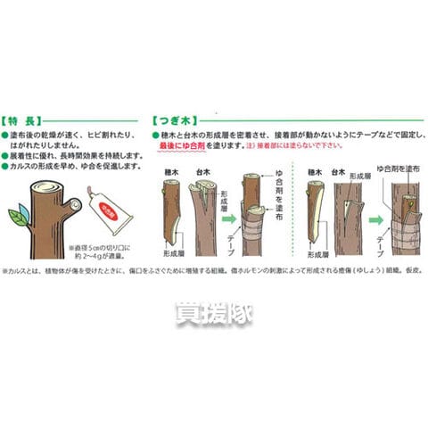 【癒合剤 保護剤 傷口 切り口 剪定 盆栽 庭木 花木 果樹 樹木 樹皮 つぎ木 薄青色 クリーム ペースト チューブ カルス形成 治癒促進 長時間効果持続 合成樹脂 蒸散 雨水浸入 防止】