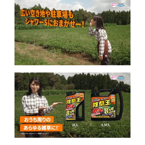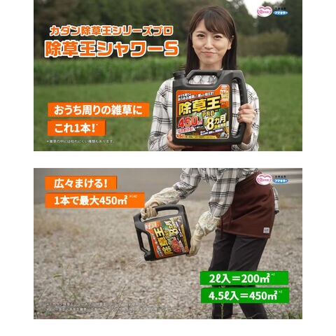 「カダン除草王シリーズプロ 除草王シャワーS」が適用拡大し、より広くまけるようになりました。2L入で最大200m2※まで一度に散布できるので、空き地や駐車場などの広いスペースもしっかり除草できます。
