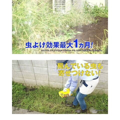 殺虫成分〈トランスフルトリン〉が、雑草のまわりに隠れているクモやムカデ、アリ、ダンゴムシなどのはう虫を速効退治。さらに持続忌避成分〈シフルトリン〉の働きで、最大1ヵ月※虫を寄せつけません。 ※ユスリカ、アリ、ダンゴムシ、ワラジムシ、クモ、ムカデ。使用環境により異なります。