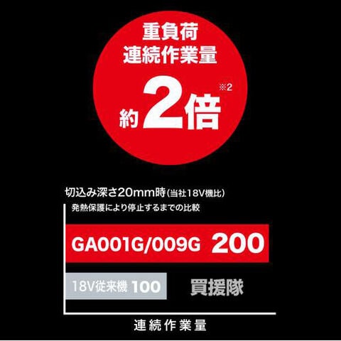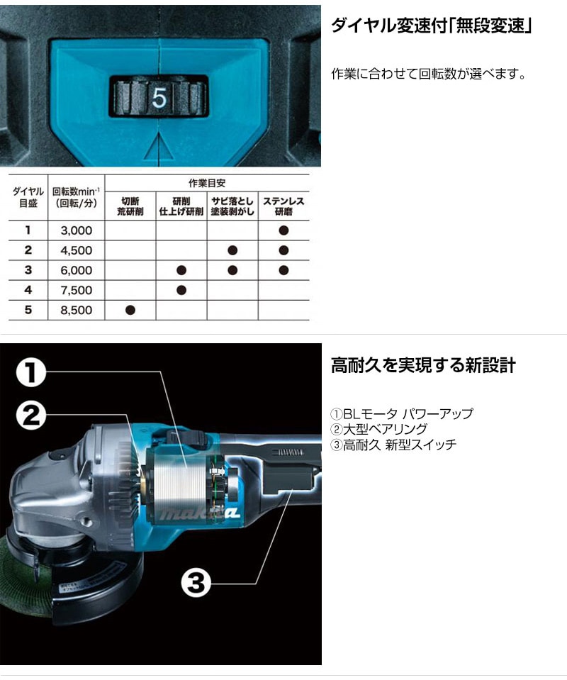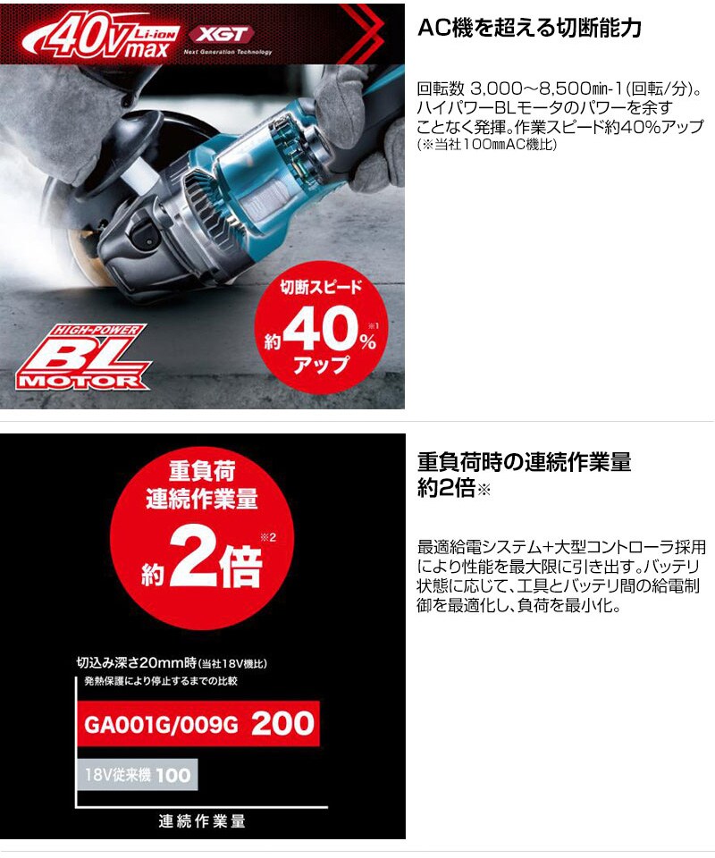 【AC機を超える切断能力】回転数 3,000~8,500min-1(回転/分)。ハイパワーBLモータのパワーを余すことなく発揮。作業スピード約40%アップ(※当社100mmAC機比)