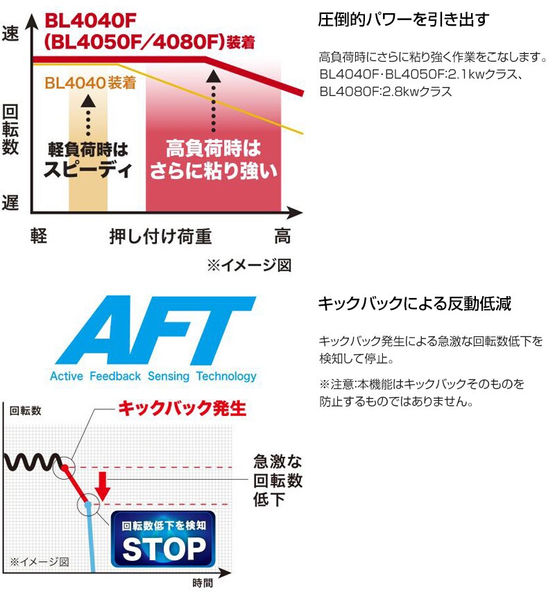 【キックバックによる反動低減】キックバック発生による急激な回転数低下を検知して停止。