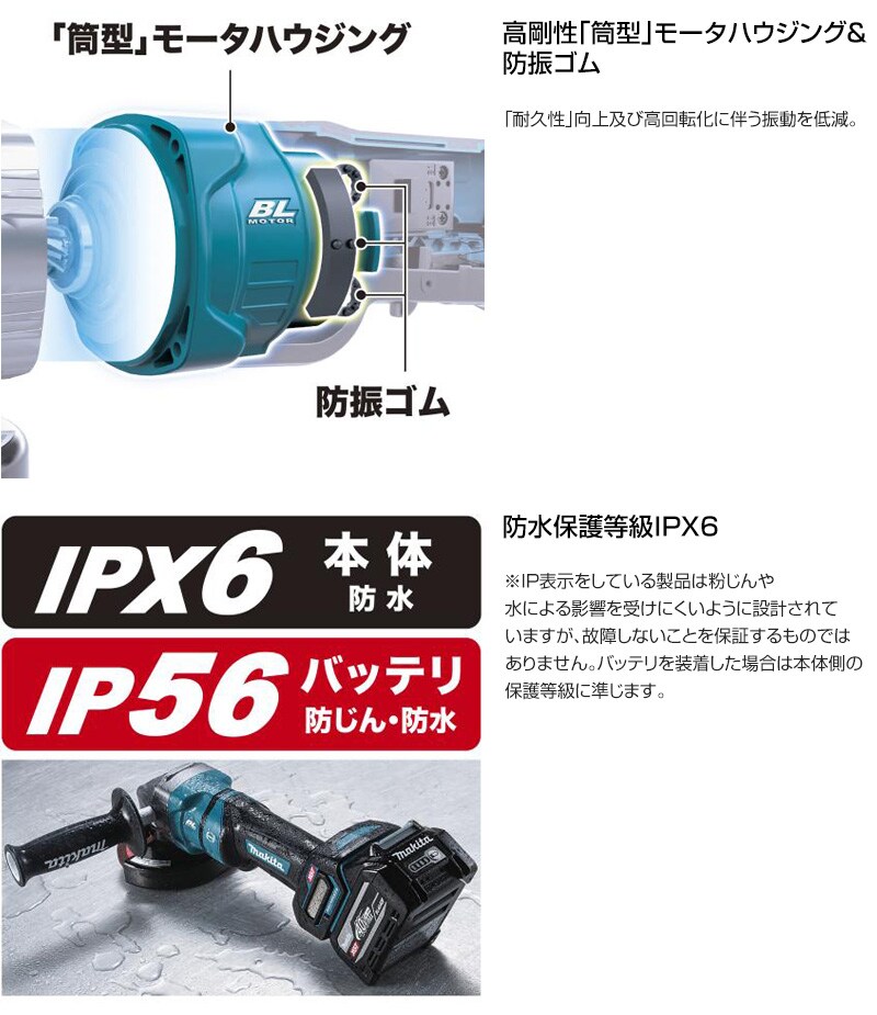 【防水保護等級IPX6】※IP表示をしている製品は粉じんや水による影響を受けにくいように設計されていますが、故障しないことを保証するものではありません。バッテリを装着した場合は本体側の保護等級に準じます。