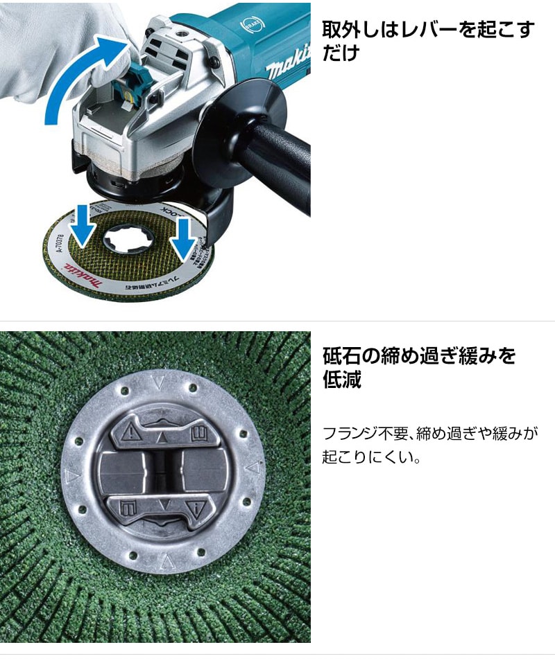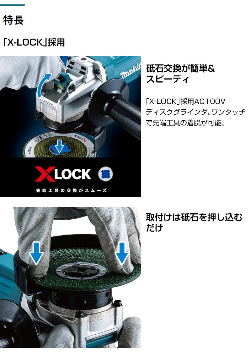 【砥石交換が簡単&スピーディ】「X-LOCK」採用AC100Vディスクグラインダ。ワンタッチで先端工具の着脱が可能。