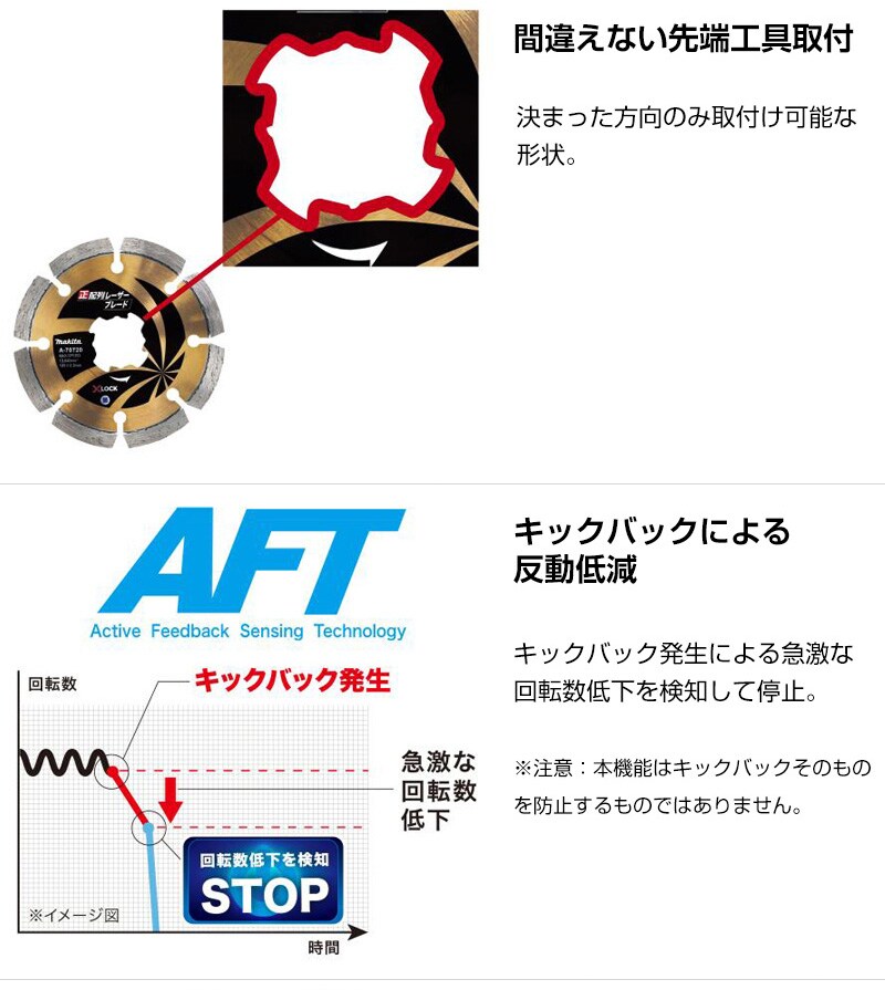 【キックバックによる反動低減】キックバック発生による急激な回転数低下を検知して停止。