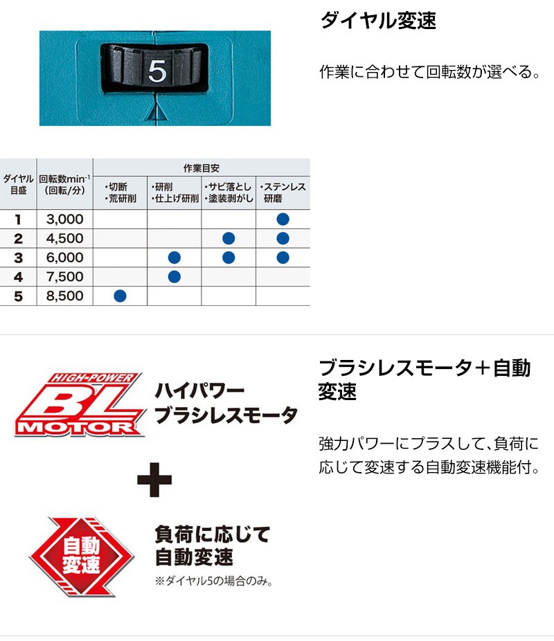 【ブラシレスモータ+自動変速】強力パワーにプラスして、負荷に応じて変速する自動変速機能付。