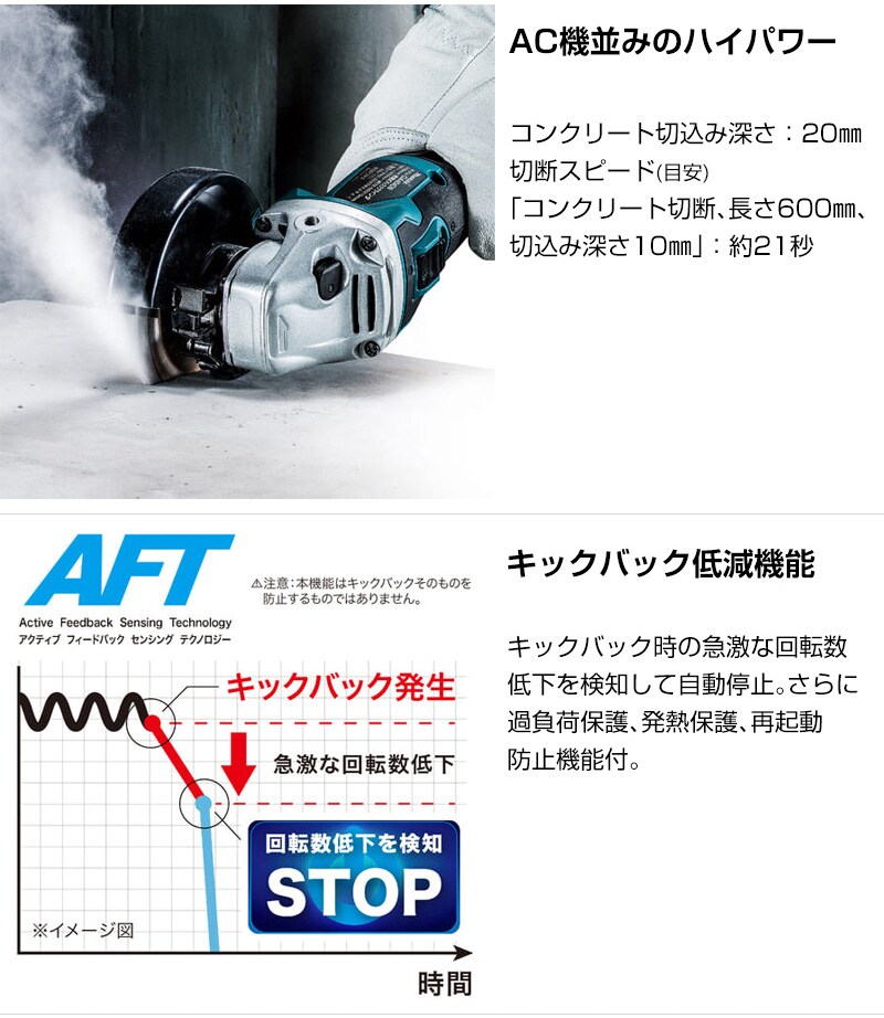 【キックバック低減機能】キックバック時の急激な回転数低下を検知して自動停止。さらに過負荷保護、発熱保護、再起動防止機能付。