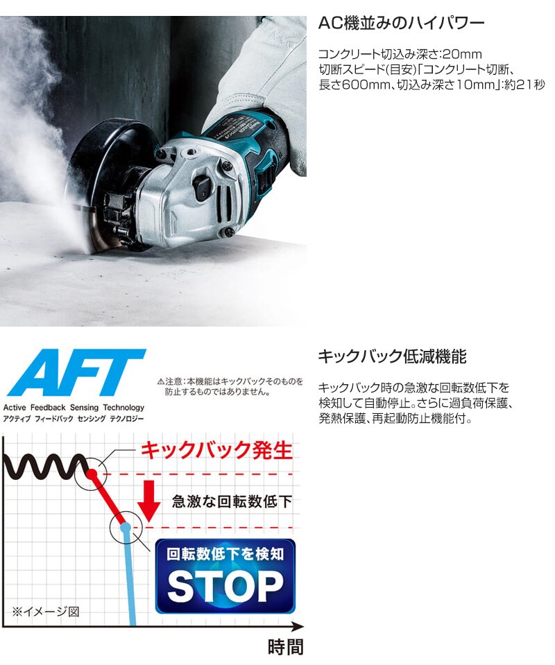 【キックバック低減機能】キックバック時の急激な回転数低下を検知して自動停止。さらに過負荷保護、発熱保護、再起動防止機能付。