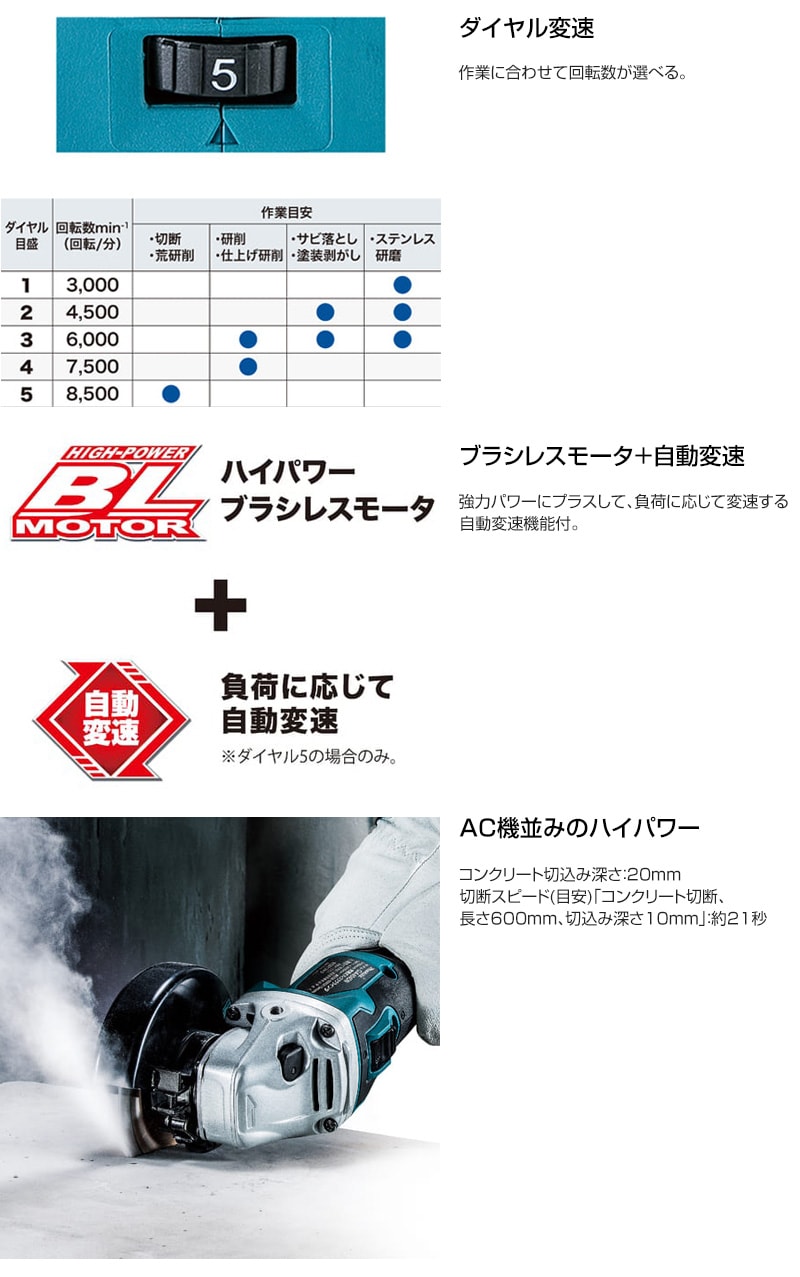 【ブラシレスモータ+自動変速】強力パワーにプラスして、負荷に応じて変速する自動変速機能付。