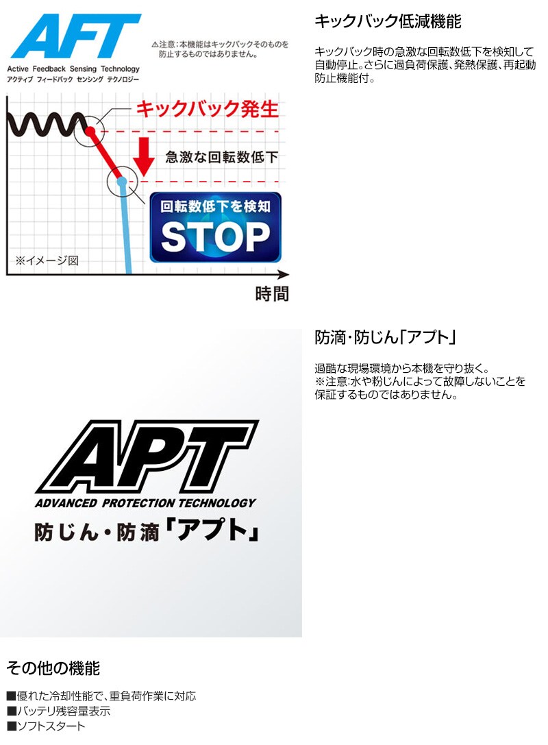 【キックバック低減機能】キックバック時の急激な回転数低下を検知して自動停止。さらに過負荷保護、発熱保護、再起動防止機能付。