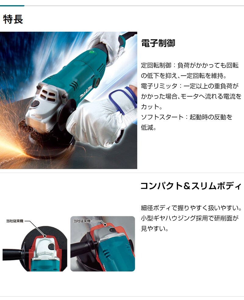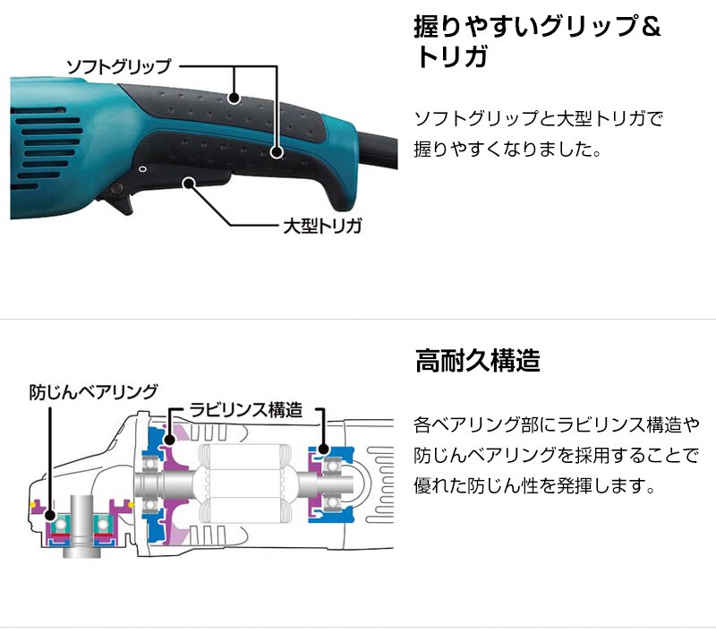 【コンパクト&スリムボディ】細径ボディで握りやすく扱いやすい。小型ギヤハウジング採用で研削面が見やすい。