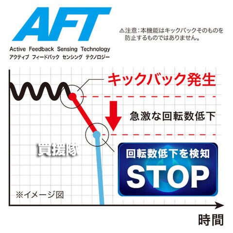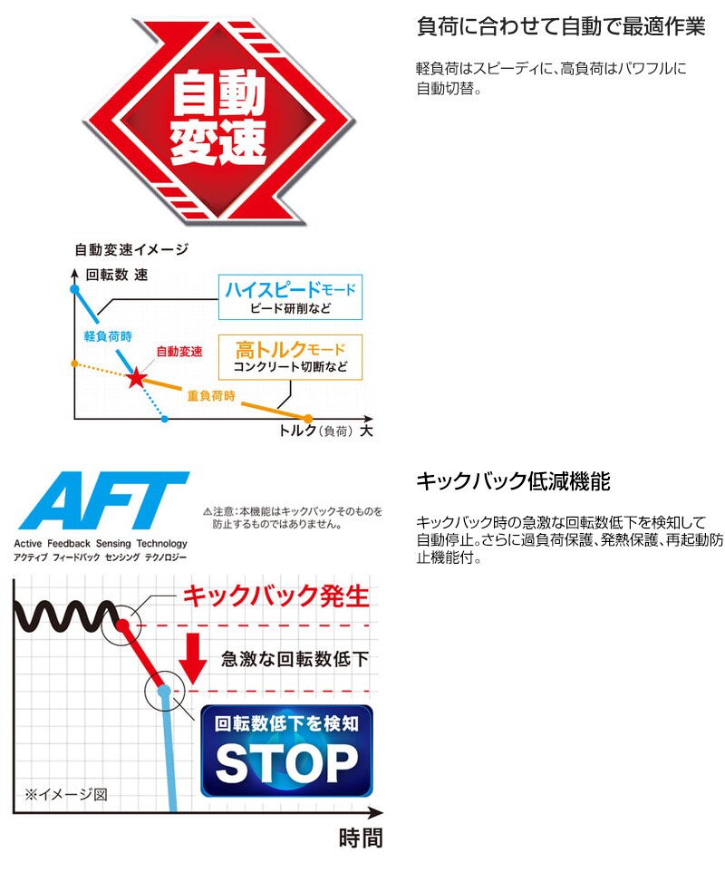 【キックバック低減機能】キックバック時の急激な回転数低下を検知して自動停止。さらに過負荷保護、発熱保護、再起動防止機能付。