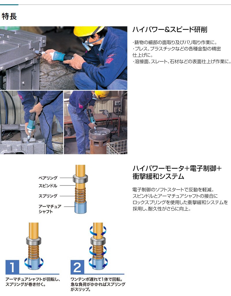 【ハイパワーモータ+電子制御+衝撃緩和システム】電子制御のソフトスタートで反動を軽減。スピンドルとアーマチュアシャフトの接合にロックスプリングを使用した衝撃緩和システムを採用し、耐久性がさらに向上。