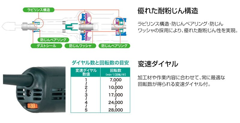 【変速ダイヤル】加工材や作業内容に合わせて、常に最適な回転数が得られる変速ダイヤル付。