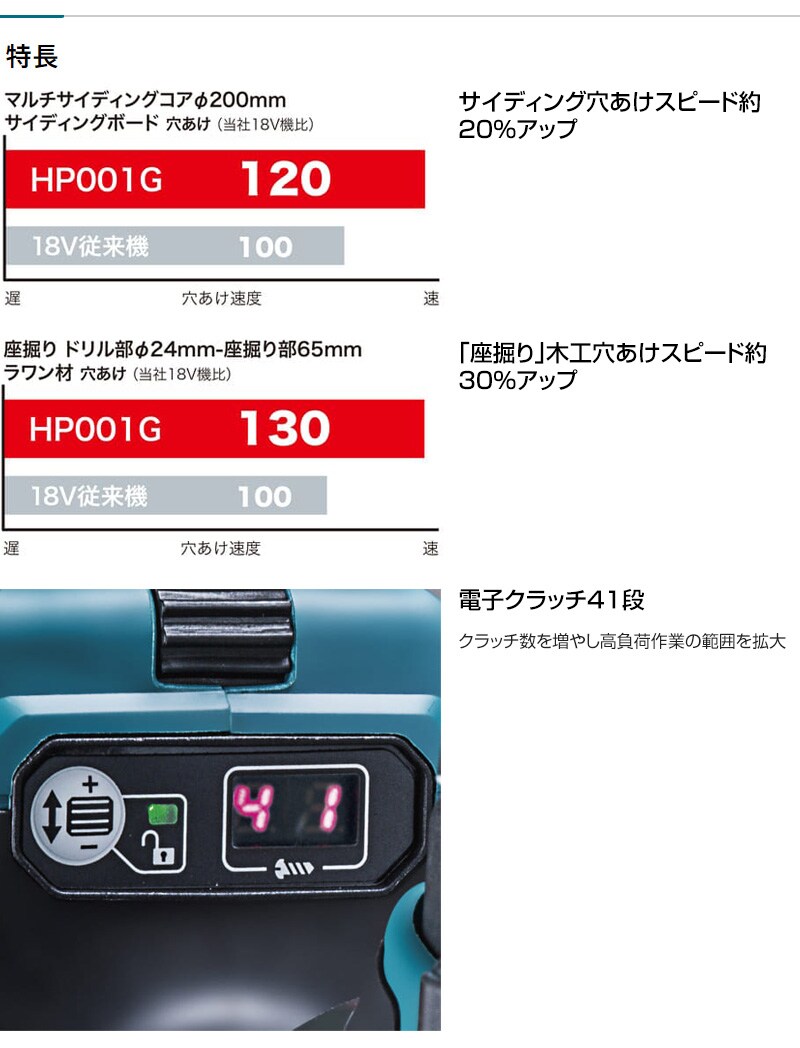 マキタ 40Vmax 充電式震動ドライバドリル [本体のみ/バッテリ・充電器・ケース別売] HP001GZ 【座掘り 穴あけ サイディング コンクリート 電子クラッチ41段 連続作業 コンパクト ショートボディ 2スピード 高輝度LEDラ】【おしゃれ おすすめ】