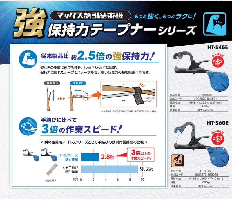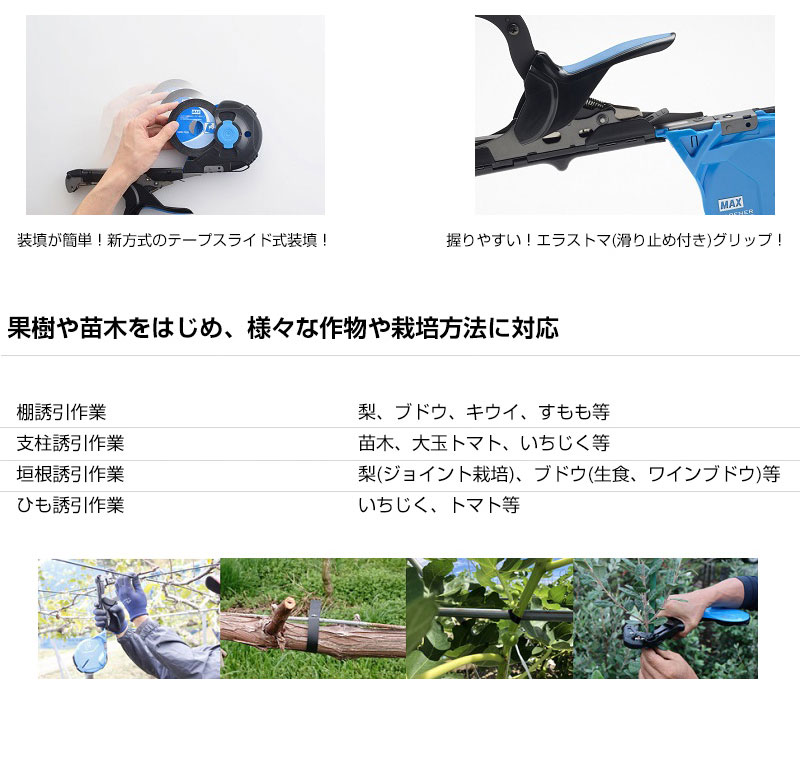 MAX 誘引結束機 強保持力 テープナー HT-S45E HT90110 【マックス 反発の強い枝もしっかり結束 結束器 支柱 垣根 棚 ひも 誘引 作業 果樹園 苗木 梨 トマト ぶどう 葡萄 いちじく 農業 農作業 家庭菜園 野菜 栽培 畑 田畑】【おしゃれ おすすめ】