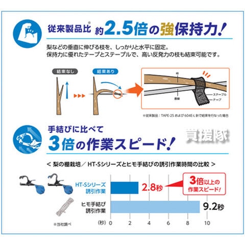 従来製品比約2.5倍以上※の強保持力テープで、梨などの反発の強い枝もしっかり結束。