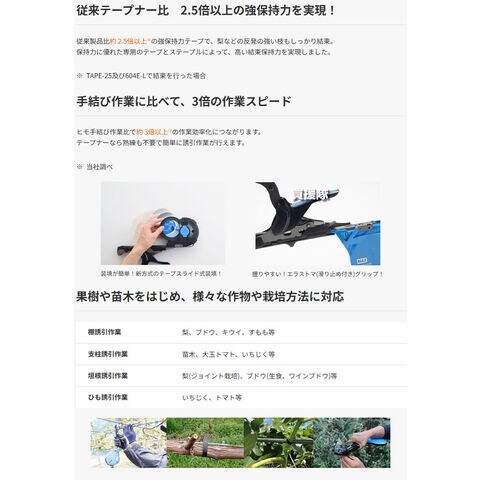 従来製品比約 2.5倍以上※の強保持力テープで、梨などの反発の強い枝もしっかり結束。