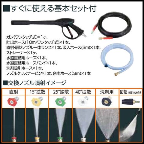 付属品 ガン(ワンタッチ式)×1ヶ、吐出ホース(10m/ワンタッチ式)×1本、直射・扇状ノズル一体ランス×1本、吸入ホース(3m)×1本、ストレーナー×1ヶ、水道直結用ホース×1本、水道直結用ホースバンド×1本、洗剤吸引ホース×1本、ノズルクリスナーピン×1本、余水ホース(3m)×1本