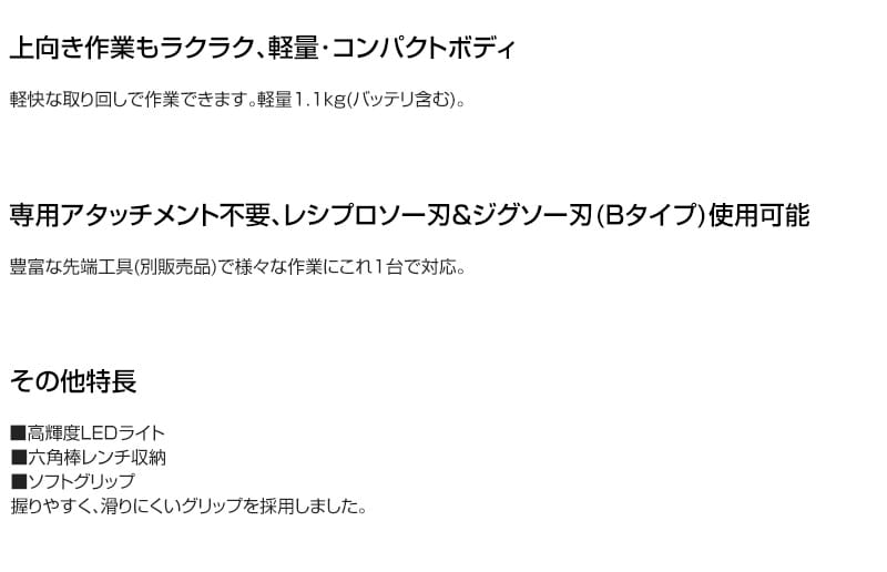 備考 小型と軽量コードレス、レシプロ&ジグソー(B)ブレード使用可能