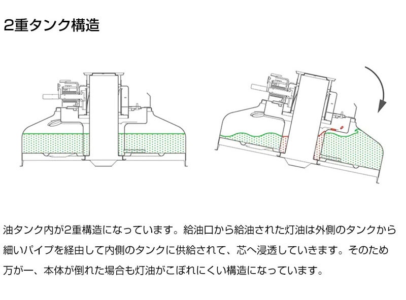 2重タンク構造 万一の転倒にも油がこぼれにくく安全です。