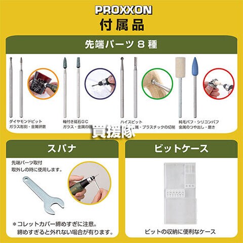 付属品  ダイヤモンドビット2種 各1本、ハイスビット2種 各1本、軸付き砥石(GC)2種 各1本、純毛バフ1本、シリコンバフ1本、専用ビットケース 1個