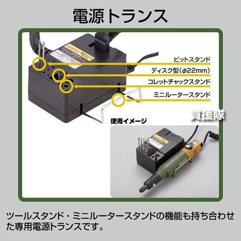 付属品 コレットチャック φ2.35/3.0mm用、電源トランス、ダイヤモンドビット 丸型、軸付き砥石 矢型、ハイスビット 棒、ツールスタンド、スパナ