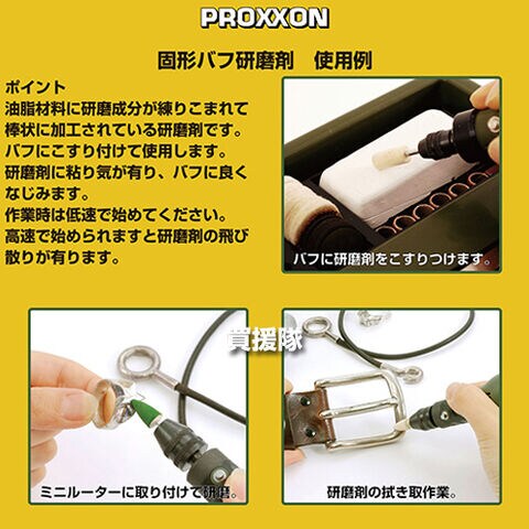 用途 磨き、研磨の超仕上、つや出し用、純毛バフにつけて使用、プロクソンミニルーター用先端工具