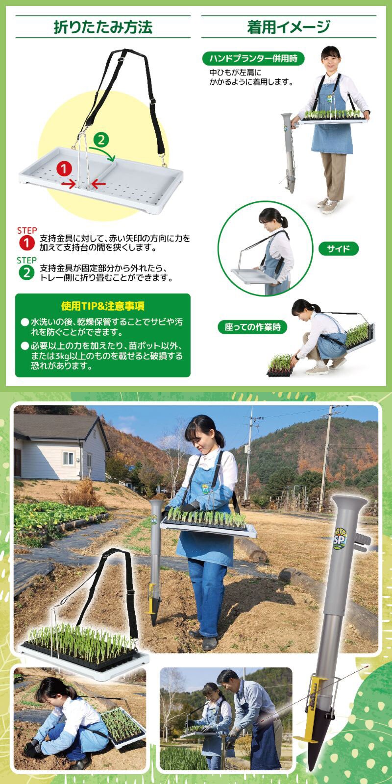 ※製品は苗ポート運搬用です。3kg以上の過度な荷重や、その他の用途で使用すると破損することがあります。