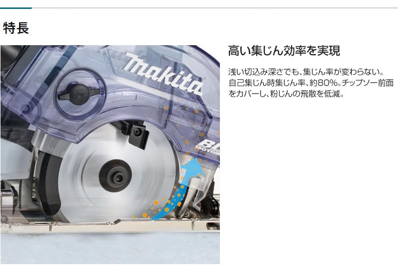 【高い集じん効率を実現】浅い切込み深さでも、集じん率が変わらない。自己集じん時集じん率、約80%。チップソー前面をカバーし、粉じんの飛散を低減。