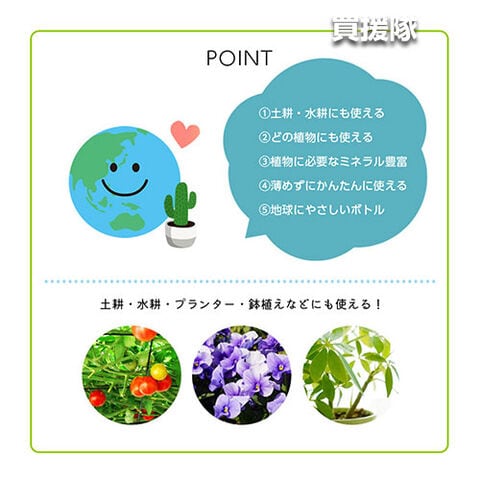 用途 (植物のカラダをつくるミネラル15種類配合)チッソ、リン酸、カリ+不足しがちな12種類もの豊富な栄養素配合!カルシウム、マグネシウムもしっかり配合。