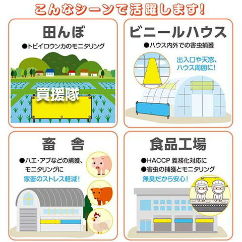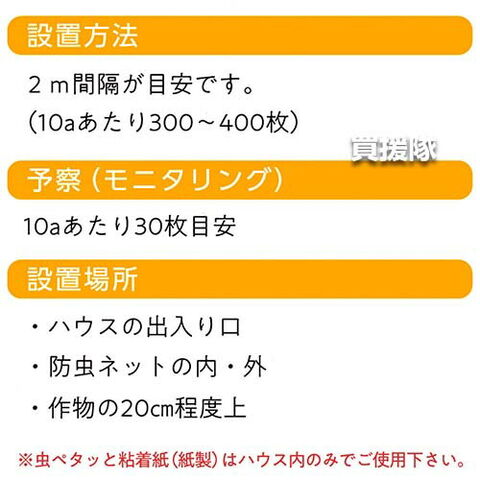 設置場所 ハウスの出入り口、防虫ネットの内・外、作物の20cm程度上
