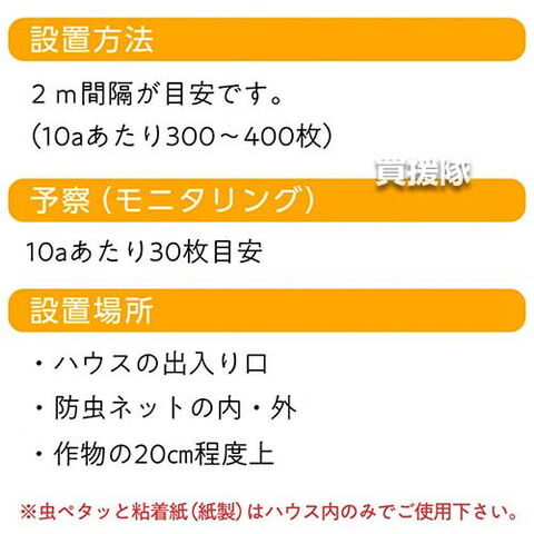 設置場所 ハウスの出入り口、防虫ネットの内・外、作物の20cm程度上