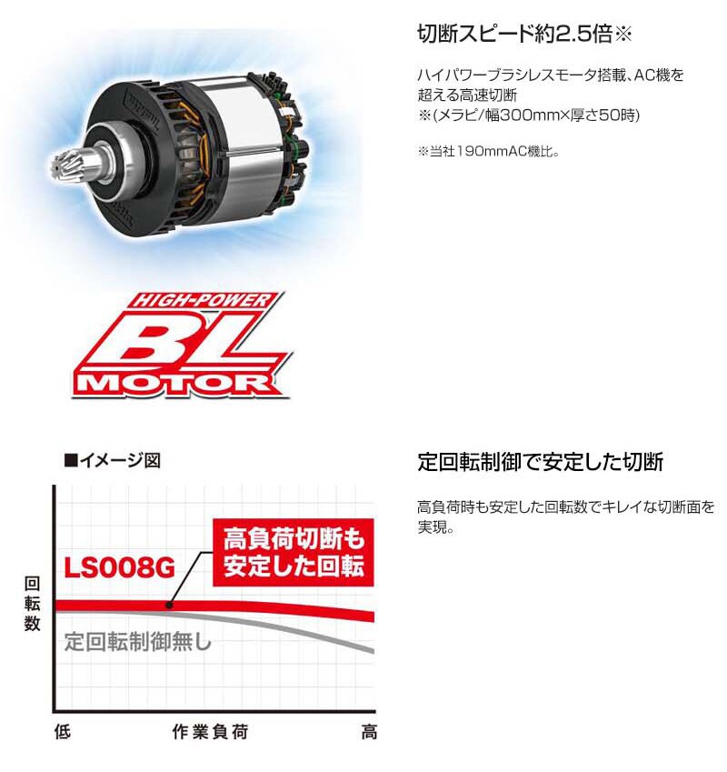 【切断スピード約2.5倍※】ハイパワーブラシレスモータ搭載、AC機を超える高速切断※(メラピ/幅300mm×厚さ50時)