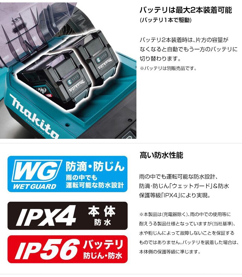 ※本製品は(充電器除く)、雨の中での使用等に耐えうる製品仕様となっていますが(当社基準)、水や粉じんによって故障しないことを保証するものではありません。バッテリを装着した場合は、本体側の保護等級に準じます。