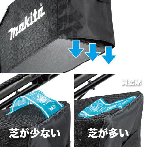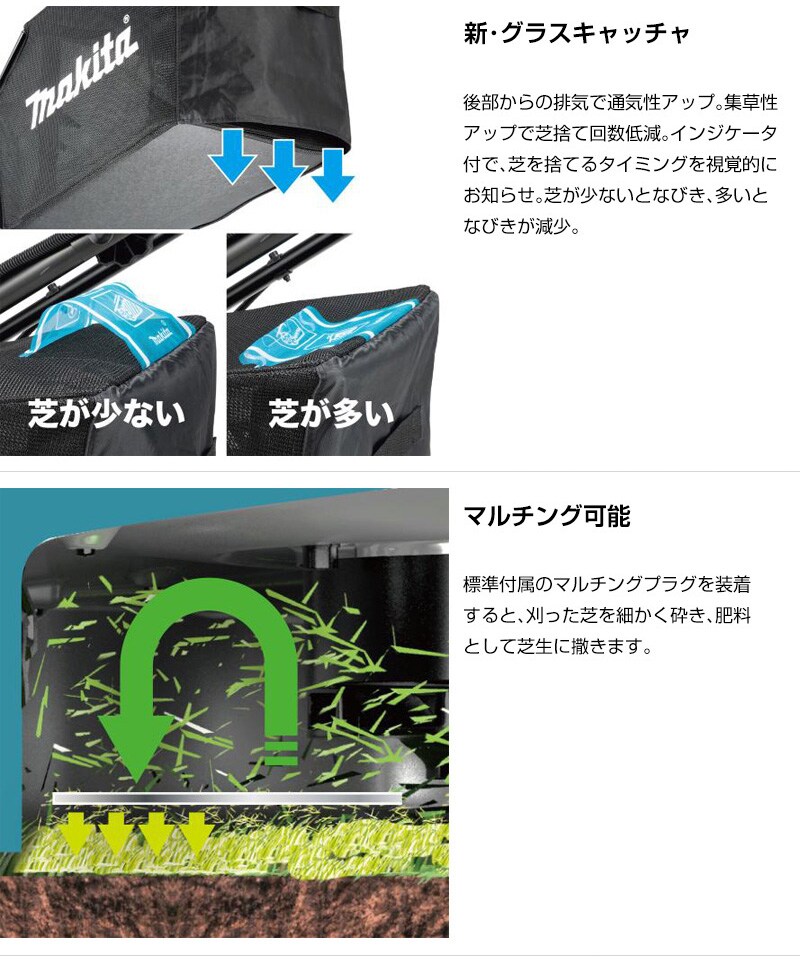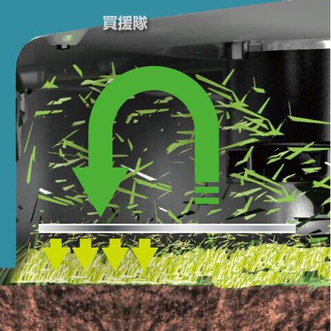 【新・グラスキャッチャ】後部からの排気で通気性アップ。集草性アップで芝捨て回数低減。インジケータ付で、芝を捨てるタイミングを視覚的にお知らせ。芝が少ないとなびき、多いとなびきが減少。