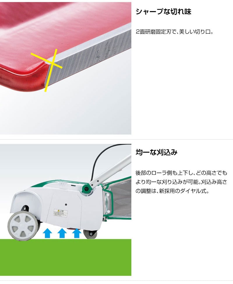 【均一な刈込み】後部のローラ側も上下し、どの高さでもより均一な刈り込みが可能。刈込み高さの調整は、新採用のダイヤル式。
